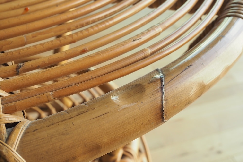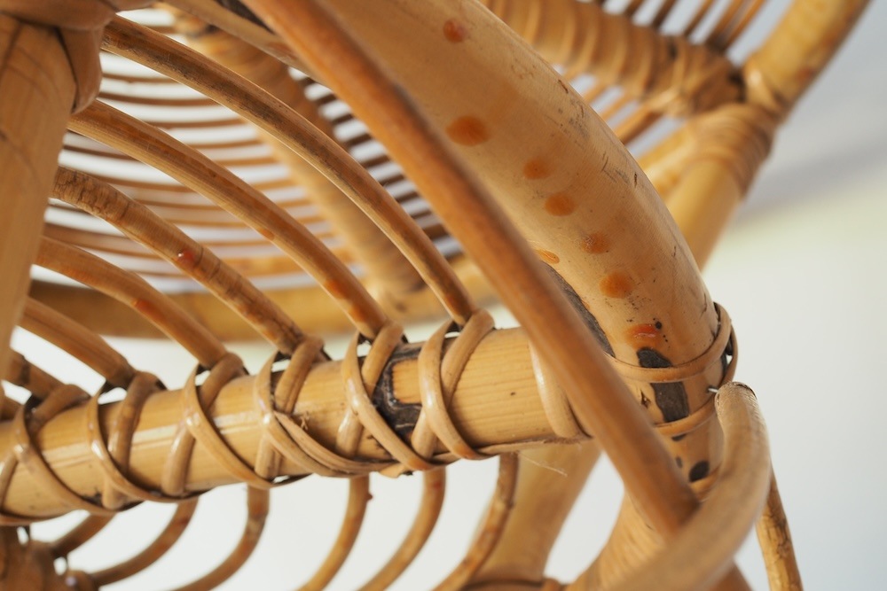 天面部分の中央から外側に向かって波紋のように広がる輪が美しいデザイン。ガラスの天板や他の板材を使わずに、ラタンの持つ抜け感を生かした姿の中に作り手のこだわりが込められているような気がします。脚のシェイプ部分には同じデザインの小さな棚が設けてあり、その下にぐるりと施された波打つようなラタンの装飾が、全体の絶妙なバランスを保つアクセントになっています。