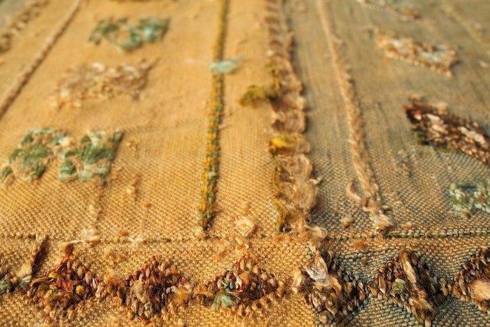 こちらのラグはスマック織という頑丈な技法によって織り上げられており、ポコポコと浮き出た幾何学模様が愛らしく、手刺繍のような温かみを感じるデザイン。オレンジをベースカラーに、ブラウン、グリーン、エクリュなど様々なカラーの糸がミックスされており、楽しげな雰囲気がありながらも、光沢を纏うシルクの糸が、全体の表情を上品にまとめ上げてくれています。ラグとしてはもちろんですが、タペストリーとして壁面を飾る姿もまた絵になります。