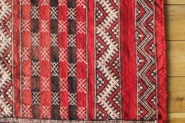 モロッコに住むベルベル人が伝統的な技法で仕立てたキリムラグです。鮮やかな赤をベースにブラウンやブラック、ホワイトの糸で構成されており、東欧の民族衣装のような愛らしい雰囲気が魅力です。細かく描かれた幾何学模様はとても精密で、且つ力強く、眺めているだけでエネルギーを感じられる一枚。ランダムに散りばめられたアイスブルーの模様が、空からふわりと降る雪の結晶のようで、その儚さもポイントになっています。