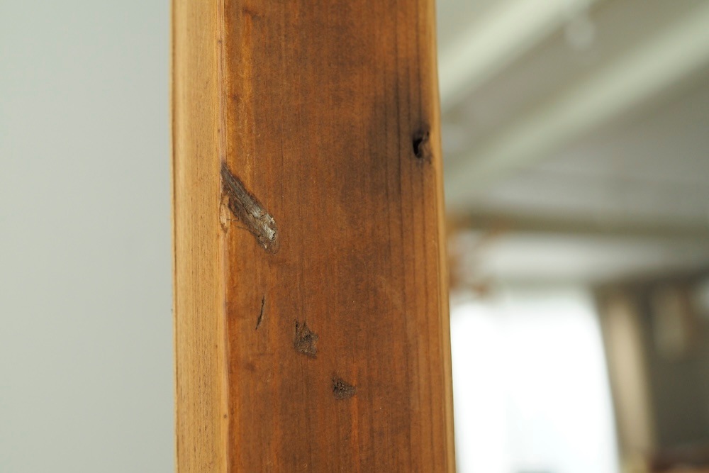 パイン材のナチュラルな木目と長い時間を経て落ち着いた風合いと柔らかく温かな空気を纏った木製のフレーム。ミラーの周りは丁寧に面取りがしてあり縁のラインのアールが可愛らしい印象を与えています。こちらは立てかけて設置、使用するタイプのもので、ある程度重量はありますが女性一人でも持ち運ぶことが可能です。また、ミラーは新しいものに入れ替えてありますので実用性も高く、ぜひリビングや自室、玄関など暮らしの中で使用していただきたい一枚です。