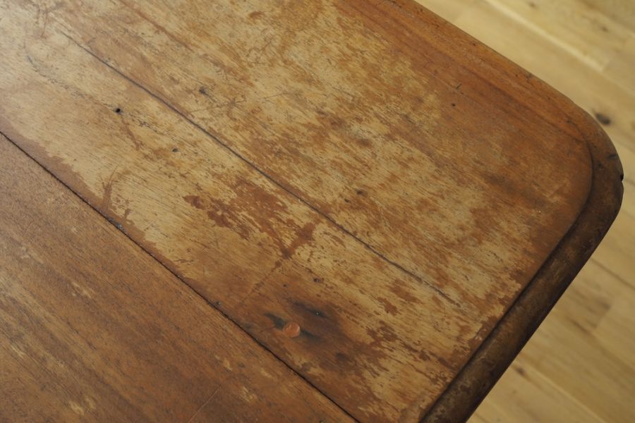 長い時間をかけて使い込まれた味わいのある風合いに育った天板と丸みを帯びたデザインの脚、華奢なキャスターが絶妙なバランスで構成されたテーブルです。天板は中央に奥行きを持たせてあり安定感があり、しっかりと収納力のある引き出しも付いています。