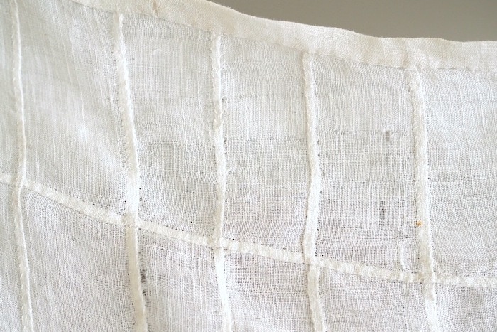 くったりと柔らかくガーゼのような透け感、触れ心地としゃりしゃりとした張りのある質感の両方が一枚のポジャギの中に存在していてリズム感のある一枚。全て同じサイズの長方形のパーツで構成されたすっきりとしたデザインは軽やかで涼やかな空気を纏っています。