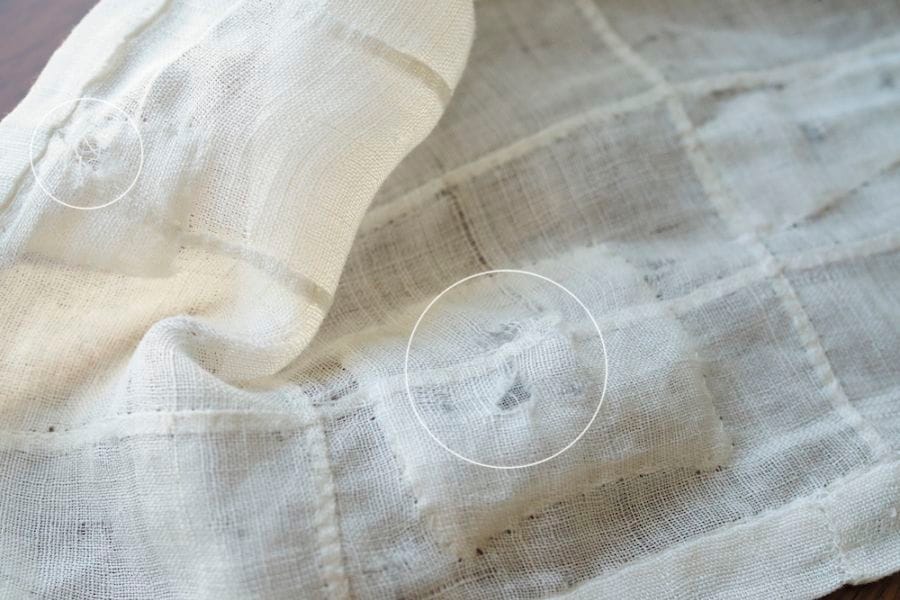 よく見るとほつれや穴を修繕した箇所があり、日常生活の中で大切に使われていたことを物語っています。